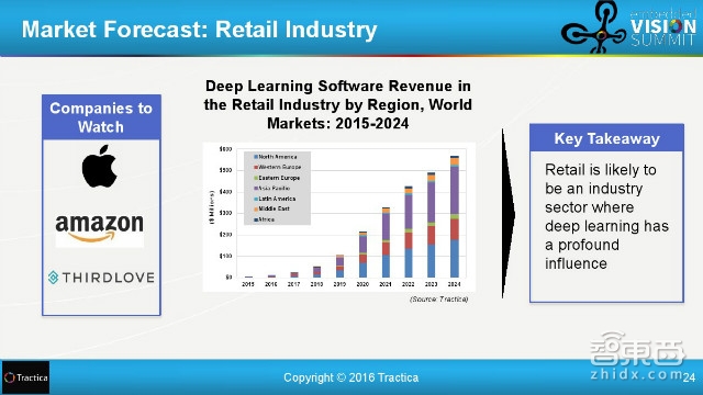 涉及到的大公司是苹果,亚马逊和Thirdlove,到2024年,深度学习在全球零售业的软件收入将逼近8亿美元。 (马云爸爸二次出镜,你听到深度学习向你呼唤了吗?)