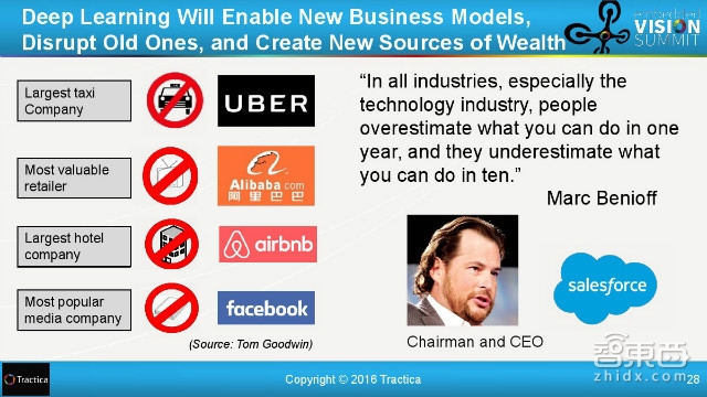 在创造新的商业模式的同时,深度学习也会破坏甚至终结一些旧的商业模式。比如Uber之于出租公司,阿里之于线下零售商,airbnb之于酒店业,Facebook之于社交媒体。管理服务公司Salesforce的CEO Marc Benioff 认为:“在各行各业,特别是科技行业,人们总是高估其一年内的生产力,却低估坚持十年所能产生的伟大变化”。