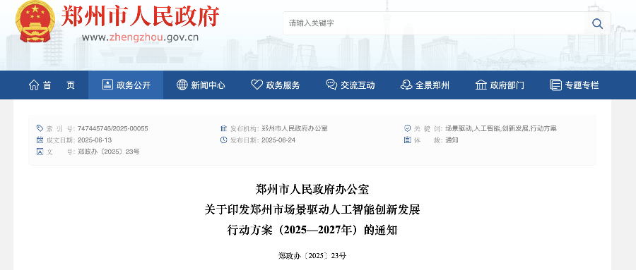 智东西6月25日报道,昨天,郑州市人民政府办公室门户网站发布了《郑州市场景驱动人工智能创新发展行动方案(2025—2027年)》的通知。