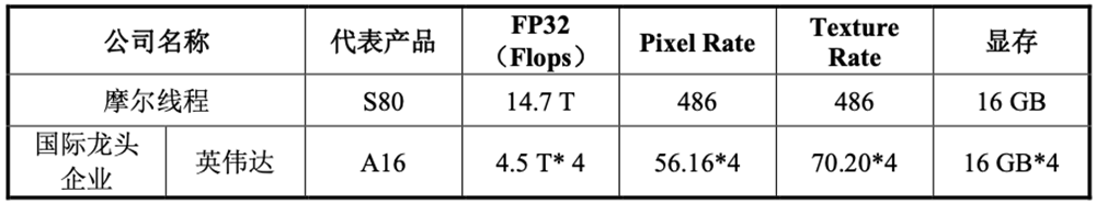 除了AI计算产品外,摩尔线程还研发了高性能GPU图形芯片。其图形卡规格与英伟达A16的比较情况如下:
