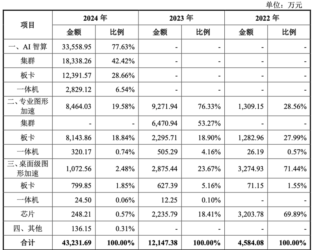 2024年,其主要产品中,AI智算集群销售3个,平均价格为6112.75万元;AI智算板卡销量为2058张,平均售价6万元;一体机卖出52台,平均价格为54.40万元。