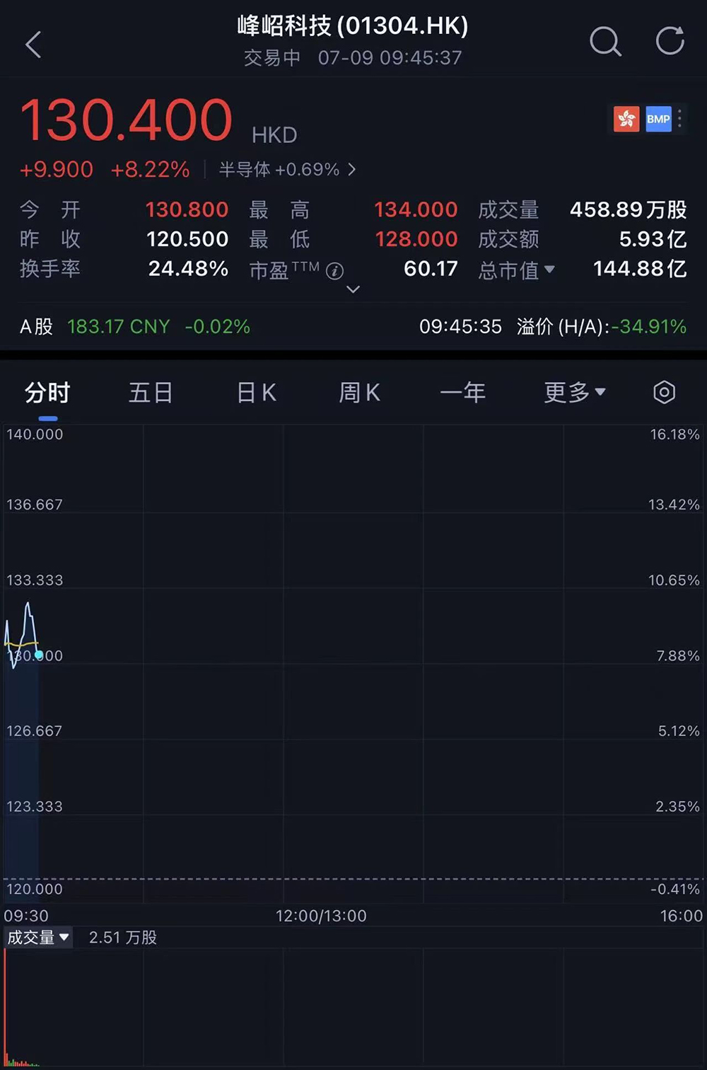 其发行价为120.5港元/股,开盘价为130.80港元/股,上涨8.55%,总市值为145亿港元(约合人民币133亿元)。截至09点45分,其股价最高涨至134港元/股。