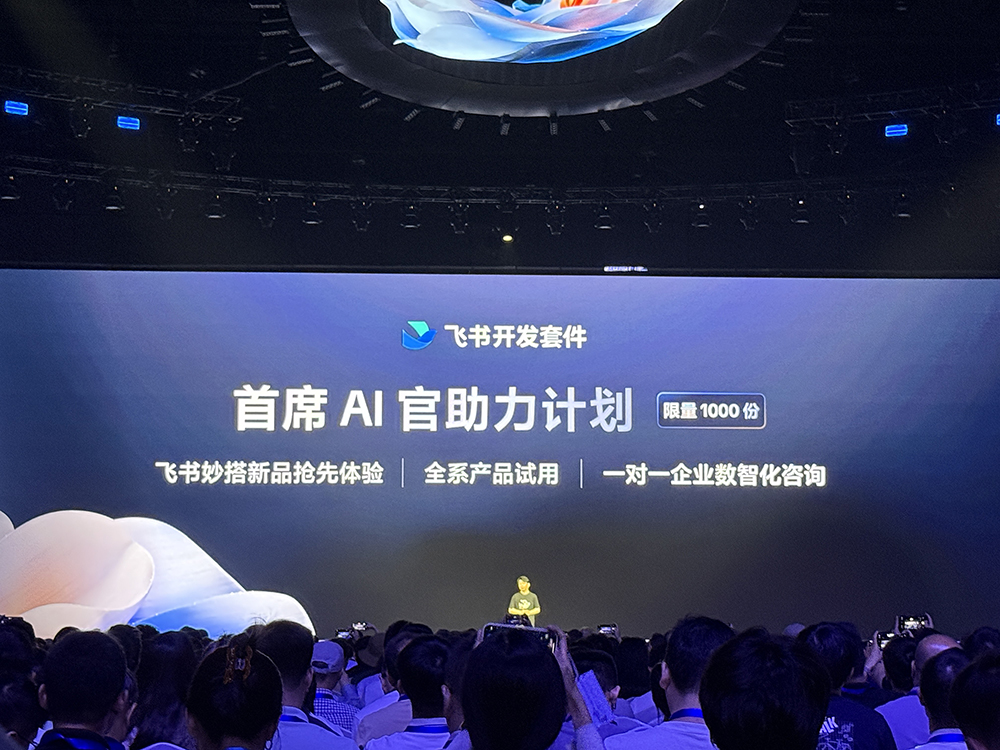 会上,飞书开发套件首席AI官助力计划正式发布。该计划提供飞书妙搭新品抢先体验、全系产品试用、一对一企业数智化咨询,限量1000份。