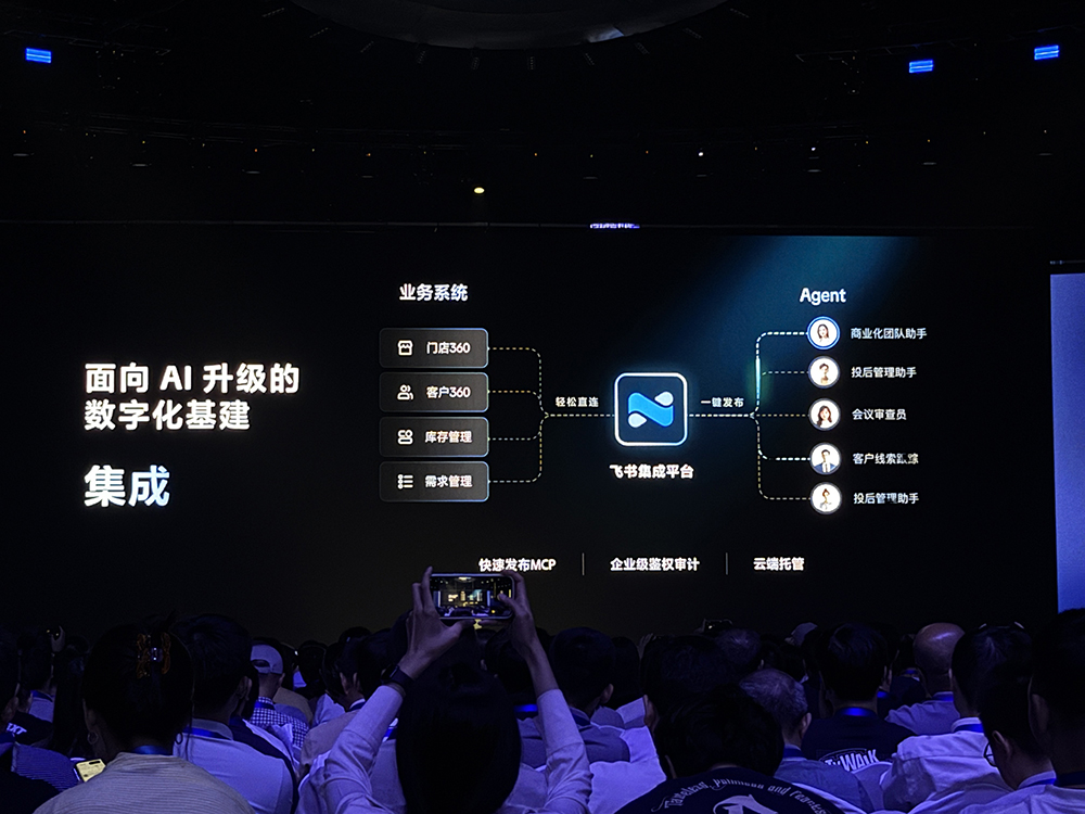 升级的飞书集成平台实现了系统与系统的连通,打破了数据孤岛,可将数据快速发布为业务系统调用(MCP);新增内网数据穿透能力,让存储在企业里的数据也能被云端AI安全调用;新增企业主数据管理,能为企业带来全局的数据定义、共享和管控。