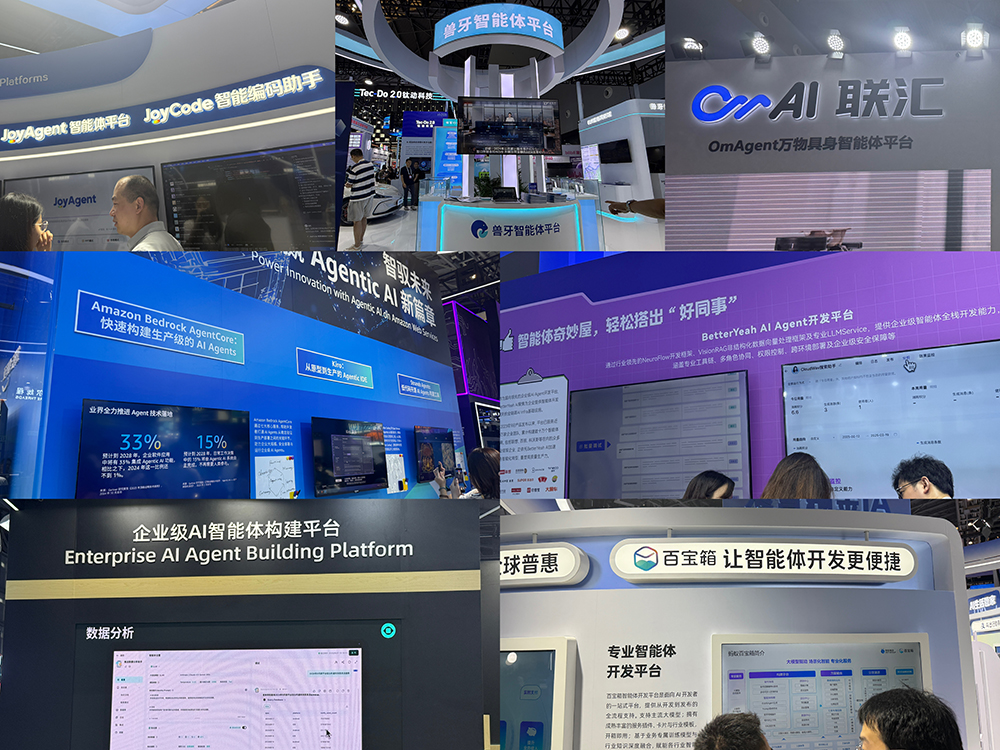 阿里、蚂蚁、京东、腾讯等国内大厂,以及澜舟科技、BetterYeah AI、极光、卓繁信息、CoreSpeed、极视角、未来式智能等企业,纷纷展出智能体开发和部署平台。