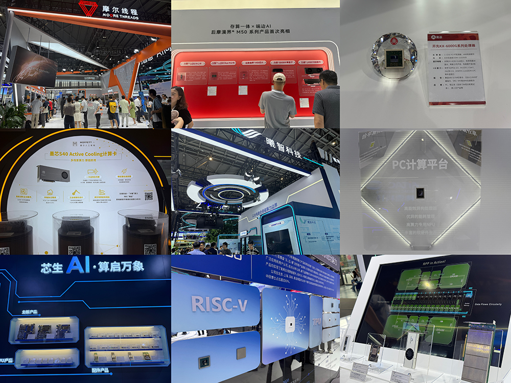 曦智科技展示国内首个光互连光交换GPU超节点方案,前身为快手集团异构计算与芯片事业部的凌川科技展示了自研芯片、计算卡和多款一体机,中昊芯英呈现国产TPU全栈解决方案,算能展示多款RISC-V处理器及TPU产品,行云集成电路展示“褐蚁”一体机。