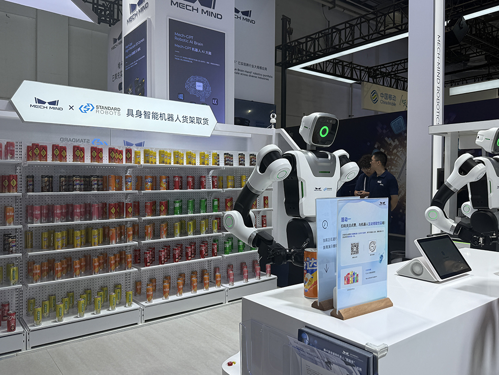 梅卡曼德和特斯拉的机器人都在H2展馆。梅卡曼德不做本体,而是重点展示其自研的机器人“眼脑手”——3D摄像头、VLA模型、灵巧手,现场有快速叠衣、分拣、摆放、取货等演示,连透明物品都能做到高精度自主识别。观众可以将让机器人取来的饮料拿走享用。