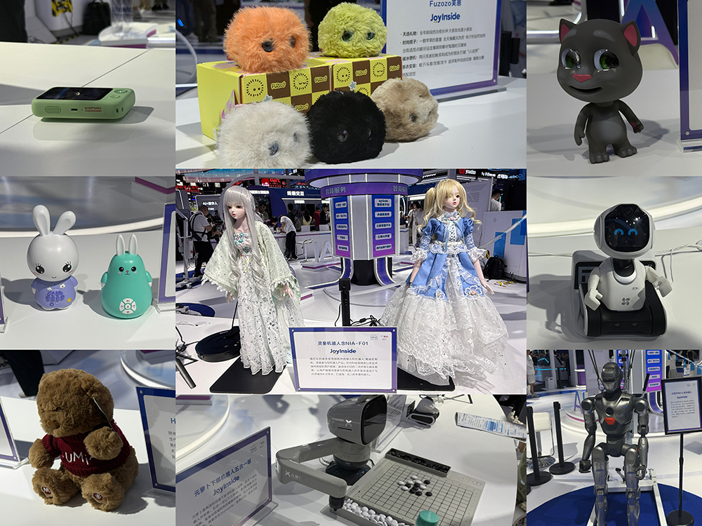 京东则大摆机器人阵,展示多款与JoyInside合作的AI潮玩、机器人或智能硬件,包括众擎人形机器人、魔法原子机器狗、商汤元萝卜下棋机器人、萤石陪伴机器人、灵童机器人、珞博智能Fuzozo芙崽、会说话的汤姆猫家族AI玩具、心大陆AI儿童成长机器人、噜咔博士AI拍学机、小鸡球球智能点读笔、HUGJOY Lumia Ai玩具熊等。
