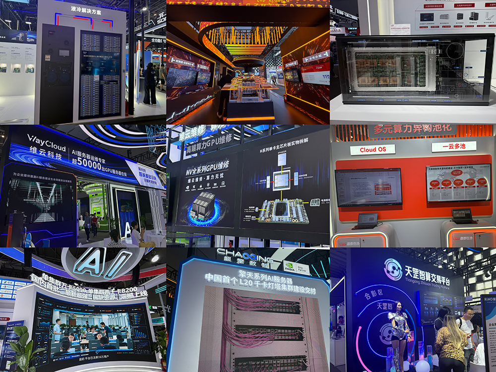 一些服务器及智算中心供应商们也积极参展,如维云信息展示GPU运维全链路解决方案,科华数据、神雲科技展示如何通过先进的液冷技术实现节能降耗,腾云智算、智绘绿洲等企业提供AI算力全链条综合服务,第三方GPU资源在线交易市场天罡智算交易平台设置了美女合影区。