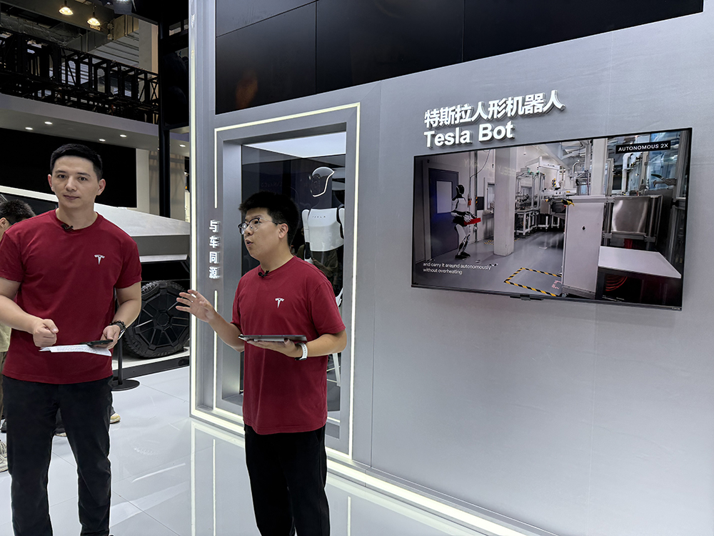 特斯拉也把与车同源的人形机器人Tesla Bot带到展会上来,不过依然是原地站桩。