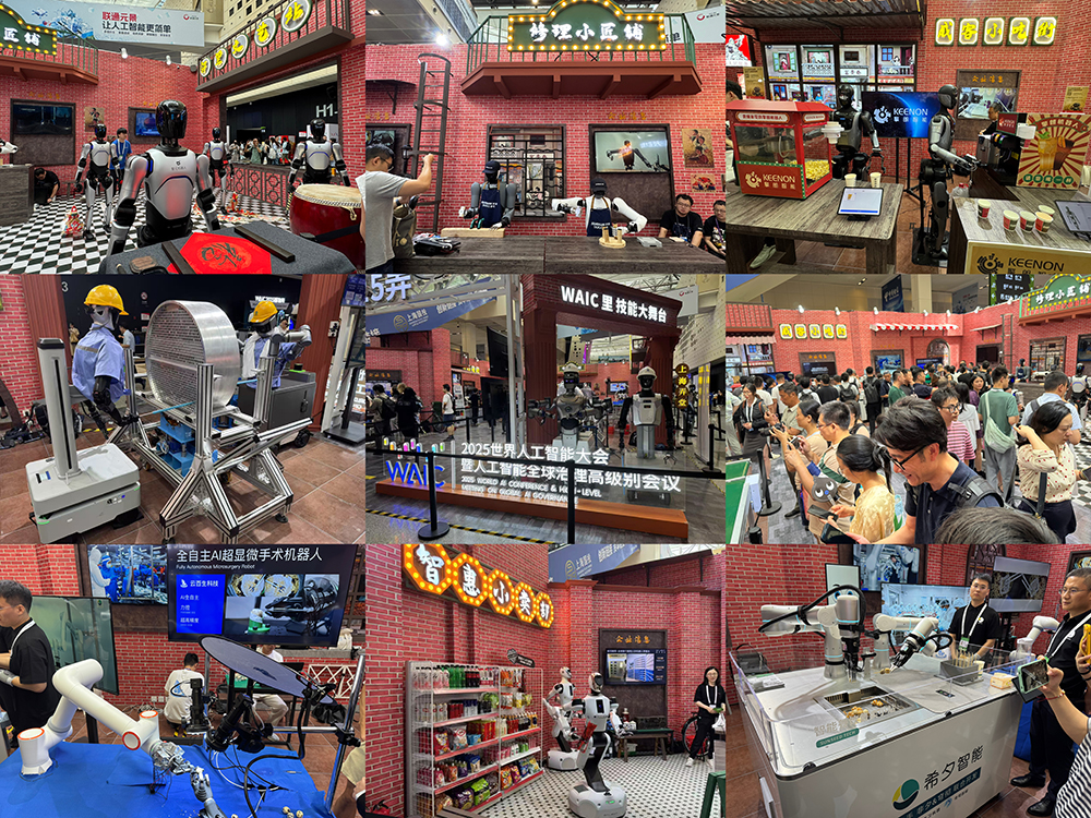 进场就能看到的「WAIC里 技能大舞台」展区,复刻了充满烟火气的老上海80、90年代弄堂场景,人形机器人在文艺站、修理铺、小吃街等场景中热火朝天炫技,完成打鼓、舞龙、书法、煮串、剥蛋、调饮品、做美食、搞维修等高精度操作。