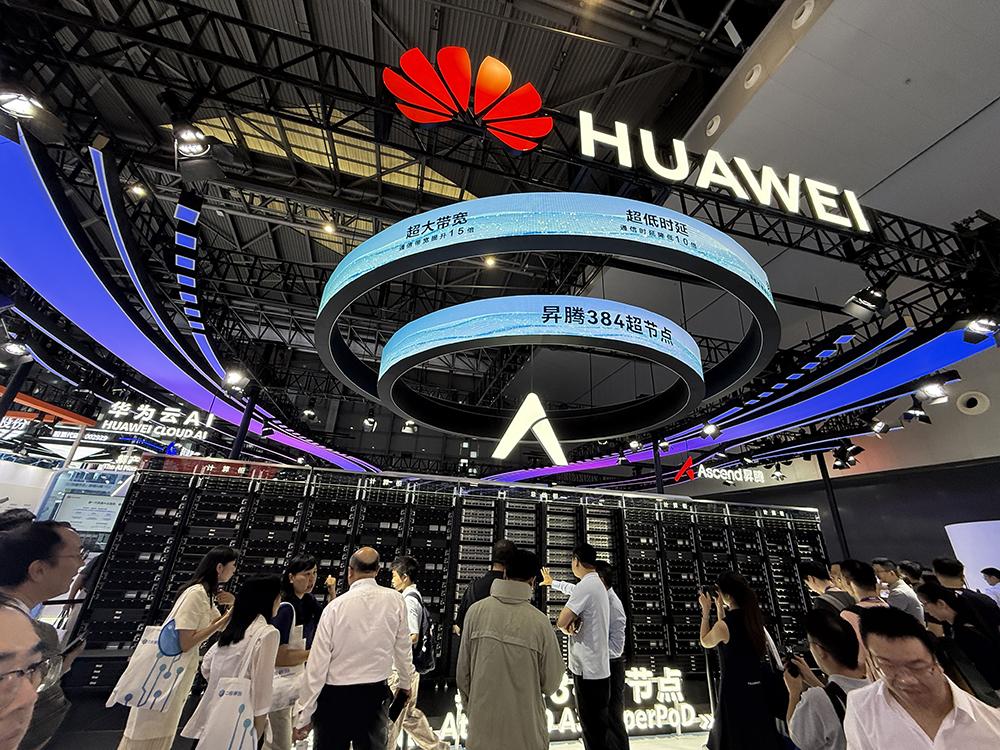 华为、阿里、百度等科技大厂均展出自家AI集群。其中最吸睛的当属华为展位,展出了业界最大规模的“昇腾384超节点真机”,由12个计算柜和4个总线柜构成,相当气派。它还能进一步扩展为包含数万卡的超节点集群。