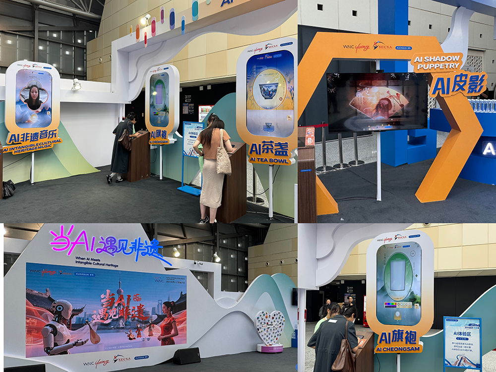 在WAIC Young展区,青少年可以体验AI+非遗文化,通过设计AI旗袍、烧制AI茶盏、合成AI音乐、操控AI皮影等交互项目,深度体验AI如何改造传统技艺。