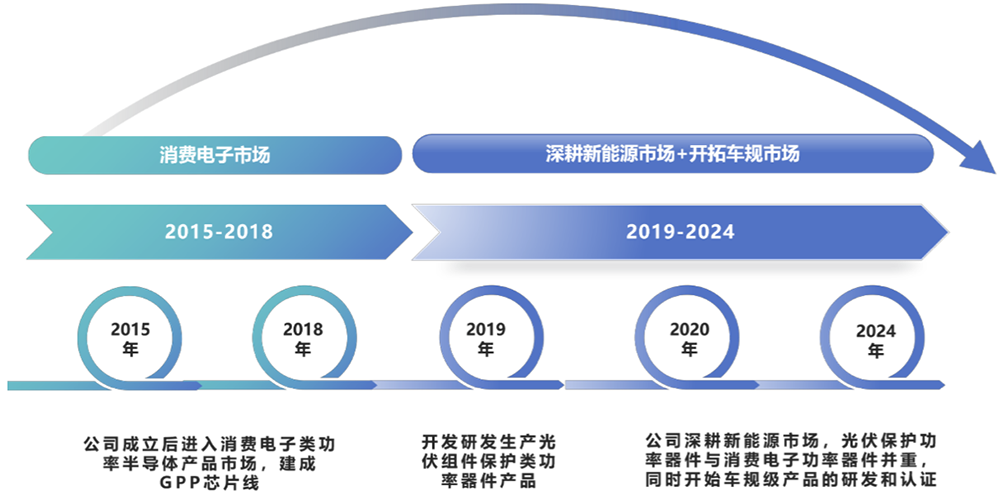其功率器件产品包括STD系列、FR系列、HER系列、SF系列、SKY系列、ZENER系列、光伏旁路轴式系列、光伏旁路模块系列、光伏旁路贴片系列、功率MOS系列等,按领域主要分为消费电子、新能源和车规电子三类,目前以新能源和消费电子类产品为主,车规电子类产品处于验证中。