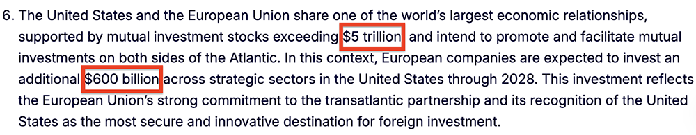 美国与欧盟拥有世界上最大的经济关系之一,其相互投资总额超过5万亿美元(约合人民币35.92万亿元),双方有意促进和便利大西洋两岸的相互投资。在此背景下,预计到2028年,欧洲企业将在美国战略领域额外投资6000亿美元(约合人民币4.31万亿元)。