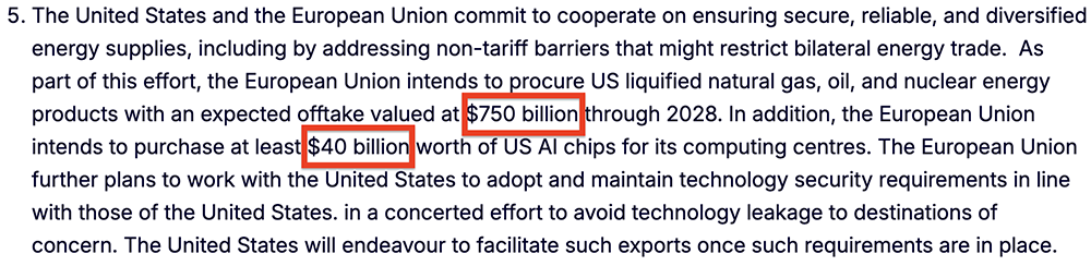 芯东西8月22日报道,昨夜,美国与欧盟发布联合声明,宣布已就《互惠、公平和平衡贸易协定框架》达成一致,美国拟立即确保对欧盟半导体等原产货物适用的关税税率不超过15%,欧盟计划为其计算中心采购至少价值400亿美元(约合人民币2873亿元)的美国AI芯片。
