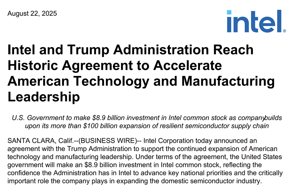 美国政府成为英特尔的投资者,可能会加剧人们对英特尔“大到不能倒”的看法。