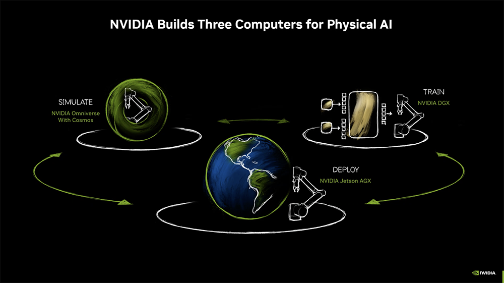 目前,英伟达专注于为物理AI和机器人打造3台计算机,包括用于训练模型的NVIDIA DGX AI超算、用于合成数据生成与仿真测试的NVIDIA OVX计算机以及安装在机器人本体上的实时计算机(如Jetson Thor)。