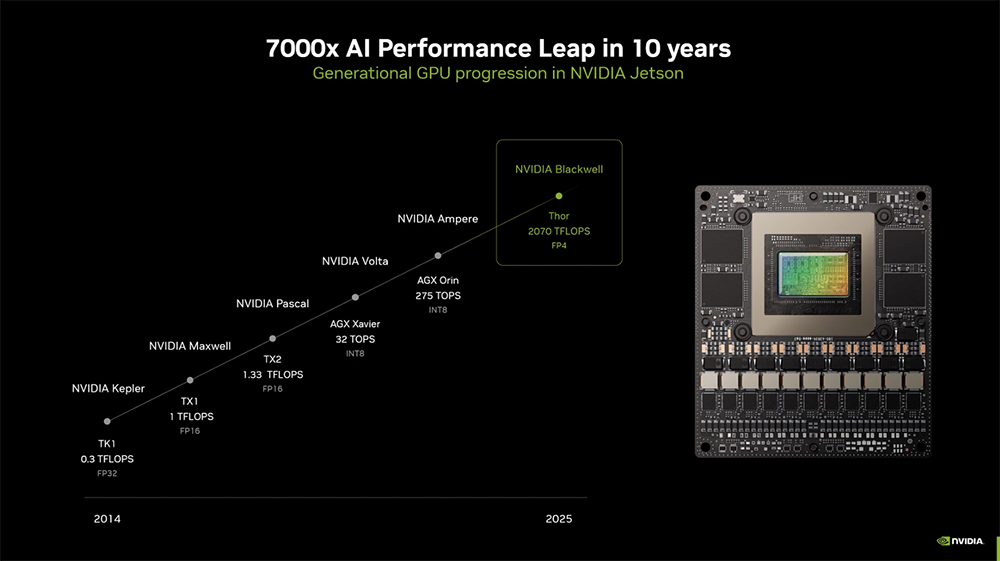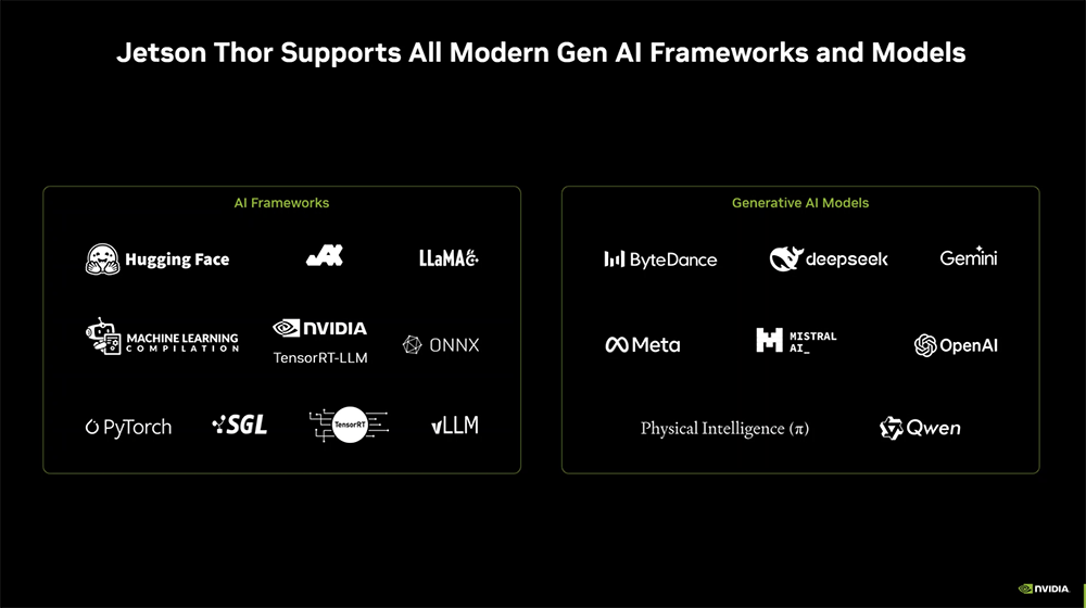 Jetson Thor与机器人AI软件平台搭配,支持各种主流AI框架,以及字节跳动、DeepSeek、阿里Qwen、谷歌Gemini、Meta、Mistral AI、OpenAI、Physical Intelligence(π)等企业的生成式AI模型。