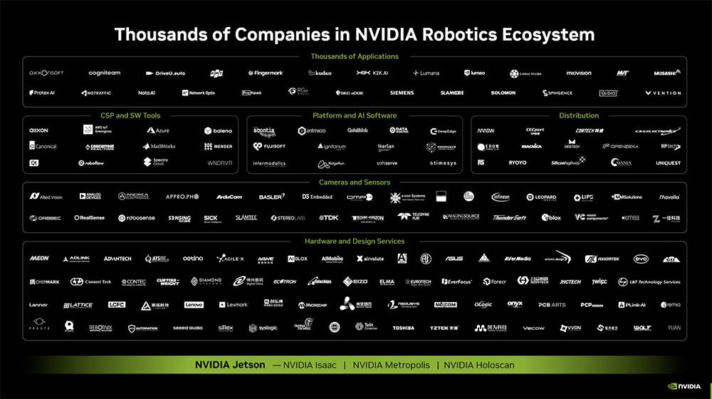 自2014年以来,英伟达Jetson平台与机器人软件栈吸引了200多万开发者和150多个硬件系统、软件和传感器合作伙伴组成的生态系统。7000多家客户已采用Jetson Orin。