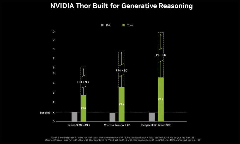 Jetson Thor为通用推理而设计,运行阿里Qwen 3-30B-A3B、英伟达Cosmos Reason 1 7B、DeepSeek-R1-Qwen-32B等推理模型时,FP8精度下性能已经提升多达3~5倍,FP4精度下更是猛蹿一大截,最多提升至10倍。