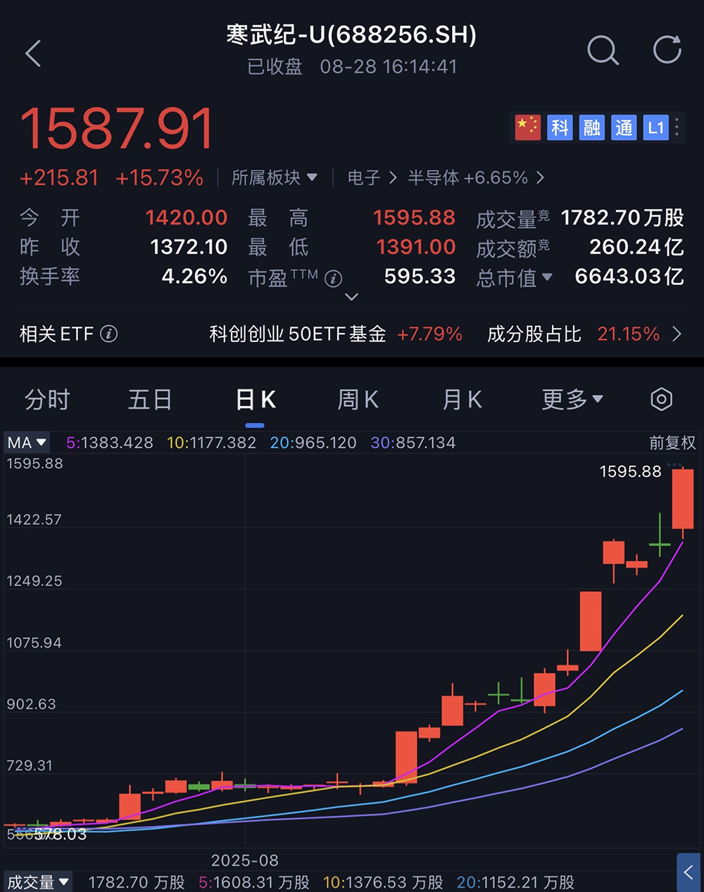 其股价涨幅显著高于同期相关指数涨幅公司股价,2025年8月28日收盘价为1587.91元/股,相较于7月28日收盘价上涨133.86%,涨幅超过大部分同行业公司股价涨幅且显著高于科创综指、科创50、上证综指等相关指数涨幅。