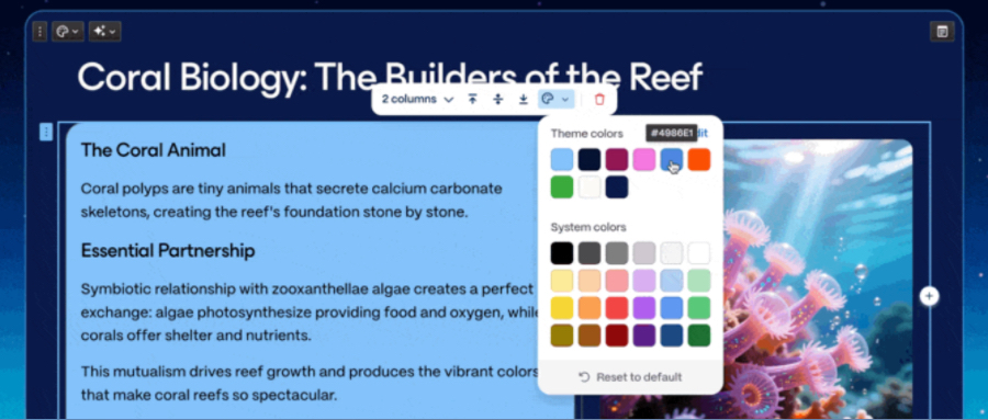 在实际体验中,页面结构清晰,每一个内容模块都可以像拼积木一样拖动、替换、改排版。主题、配色、图表样式、字体比例都能一键切换。