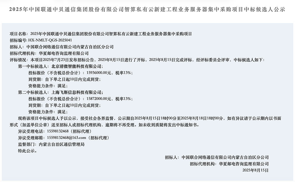 两个项目均为2025年中国联通中贝通信集团股份有限公司智算私有云新建工程业务服务器集中采购项目。