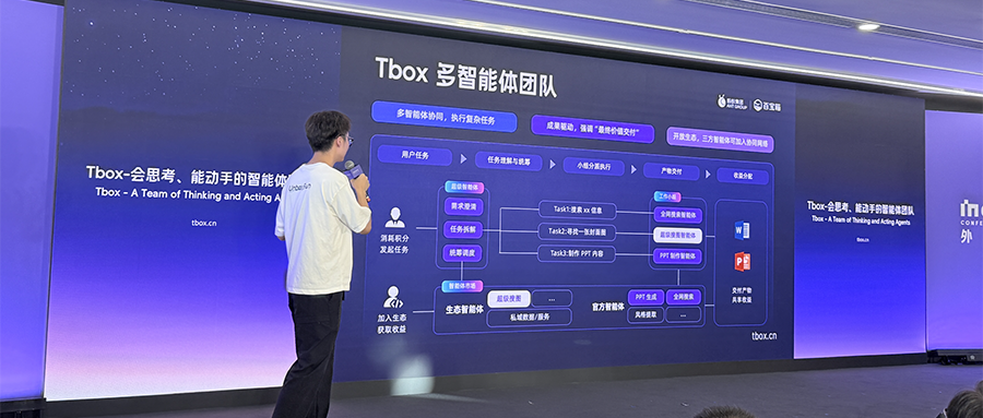 智东西9月11日报道,今日下午,蚂蚁百宝箱智能体开发平台在2025Inclusion·外滩大会上推出新产品Tbox超级智能体。全新蚂蚁百宝箱Tbox通过多智能体协同架构,能让平台上多个智能体形成工作小组,共同完成用户指定的任务,交付成果。