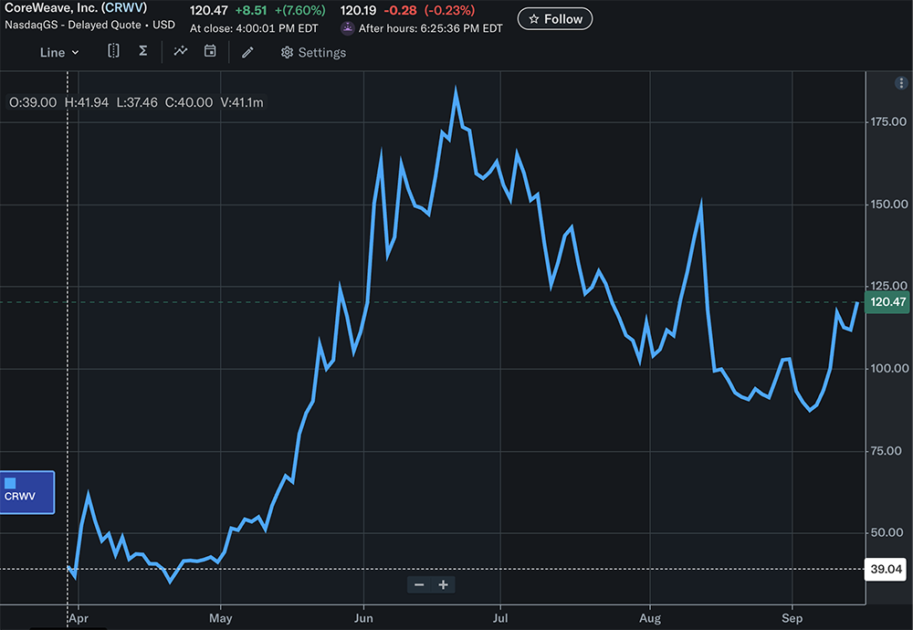 自今年3月IPO以来,CoreWeave的股价涨超207%,市值逾588亿美元(约合人民币4186亿元)。