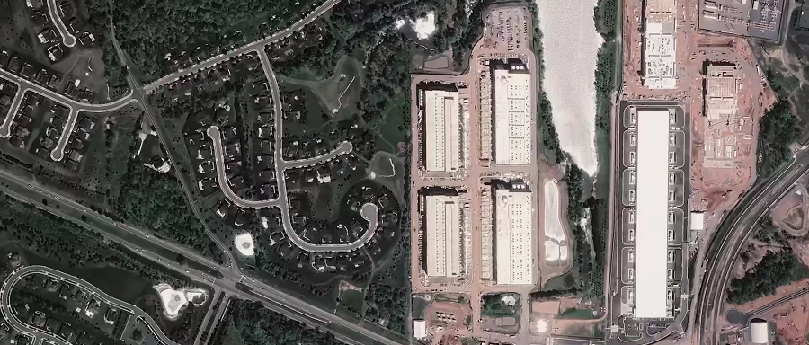 乍看之下,这里只是一处普通的美国郊区,但在高空俯瞰时,巨大的白色机房整齐排列,像一座座现代工厂。