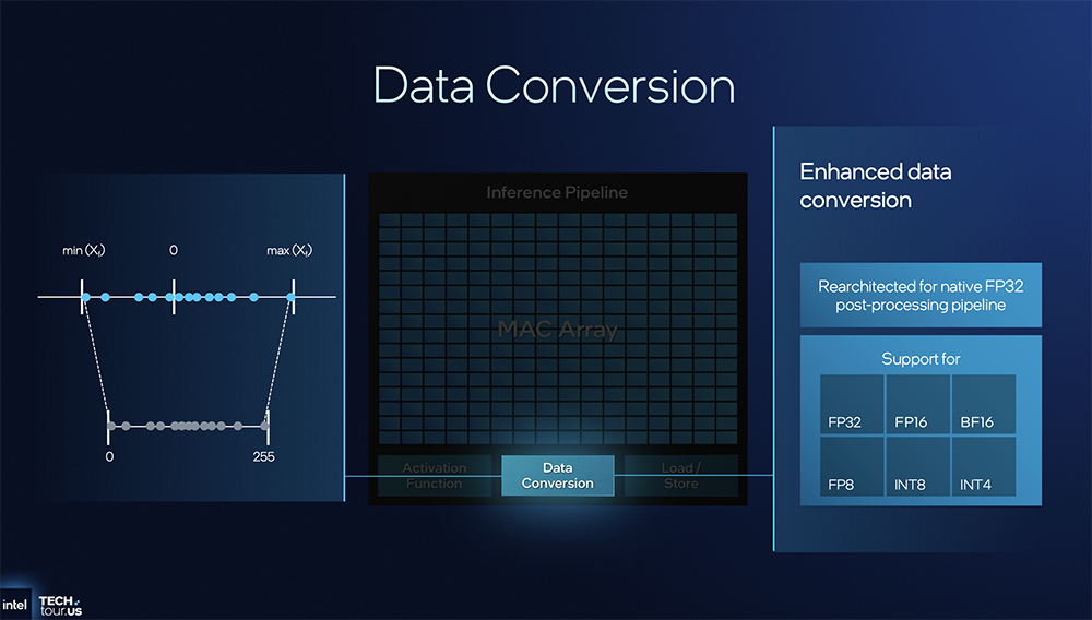 数据转换器可将不同数据格式高效转换。目前英特尔已将自定义的内部数据库或内部结构统一转换为标准的FP32格式,作为常规的计算数据,实际上是以FP32、FP16等形式存储中间结果,这使得其他IP模块能够读取中间计算结果。