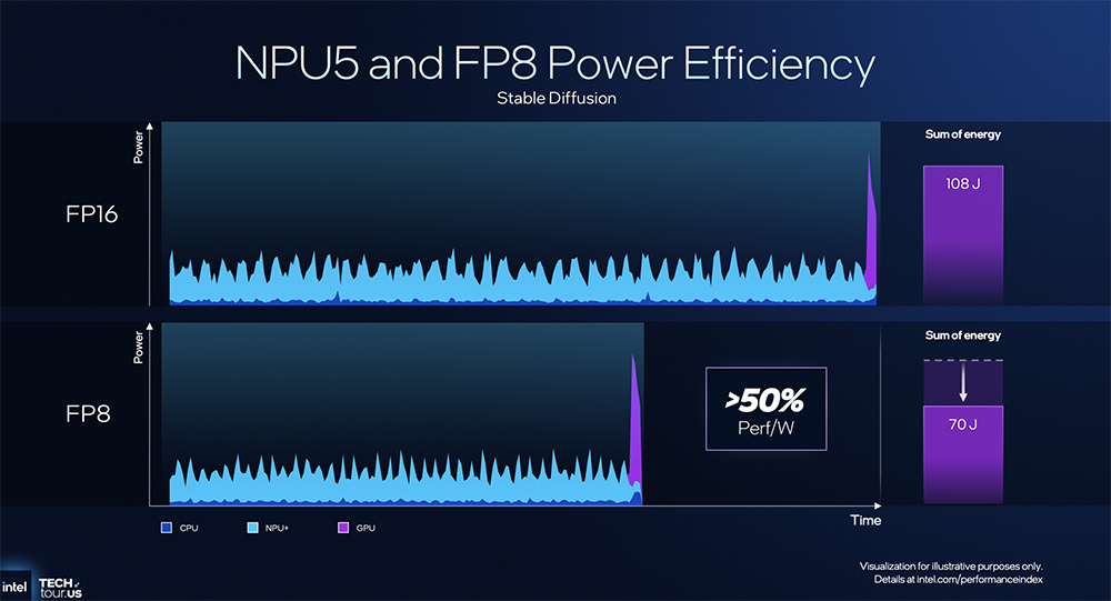 比如跑Stable Diffusion文生图模型,用NPU5+FP8精度可以将能耗从108J降到70J左右,GPU一直到最后阶段才被用到,用于图像合成。