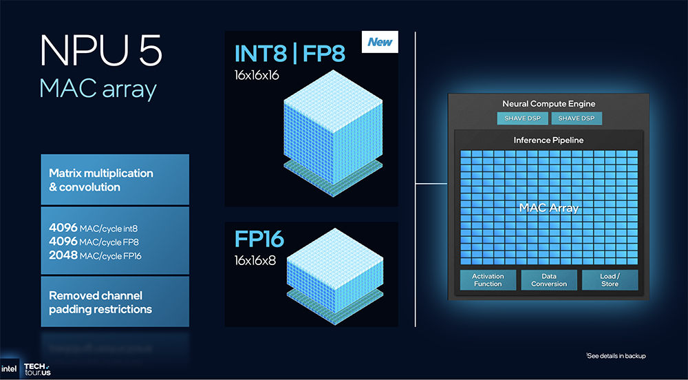 具体来看英特尔NPU5架构。英特尔认为上一代NPU4的设计不够高效,因此在NPU5进一步缩小面积,并简化了后端功能,通过MAC阵列规模翻倍,把单位面积性能提升40%。