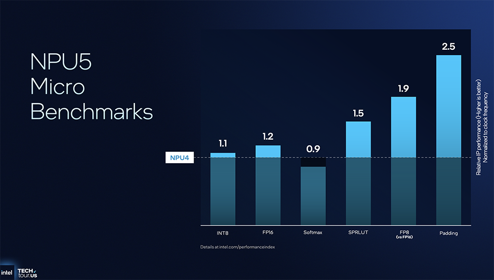 在微基准测试中,面积经优化设计的NPU5,在多种不同数据格式下性能均相比NPU4有所提升。