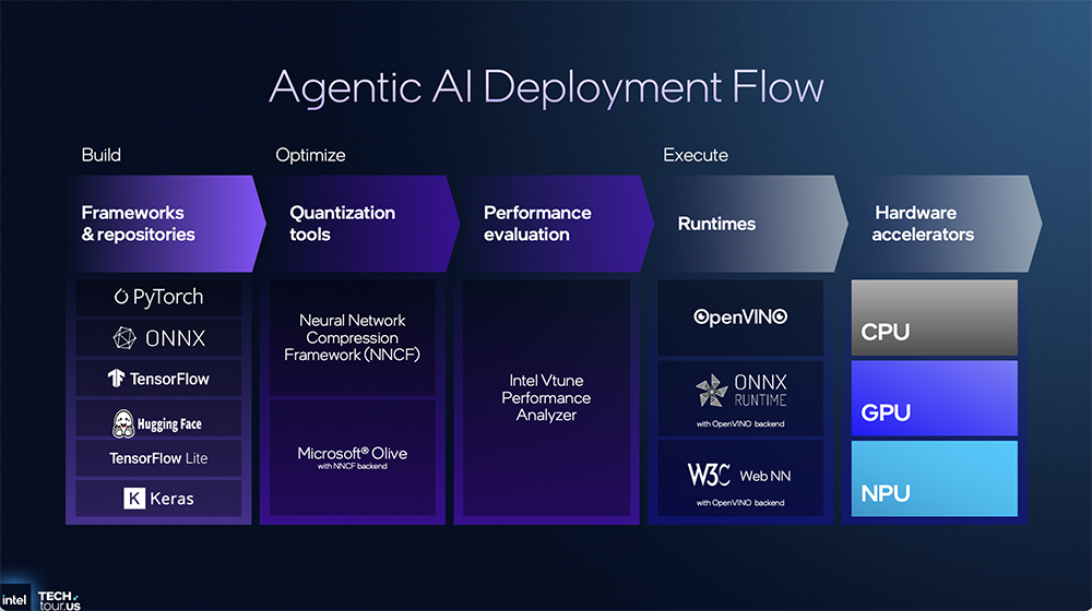 Agentic AI部署流程是构建模型-量化-性能评估-运行。英特尔提供有量化工具NNCF、评估工具Vtune性能分析器、OpenVINO软件栈,也支持ONNX Runtime及其他工具。这些都能无缝运行在CPU、GPU、NPU上。