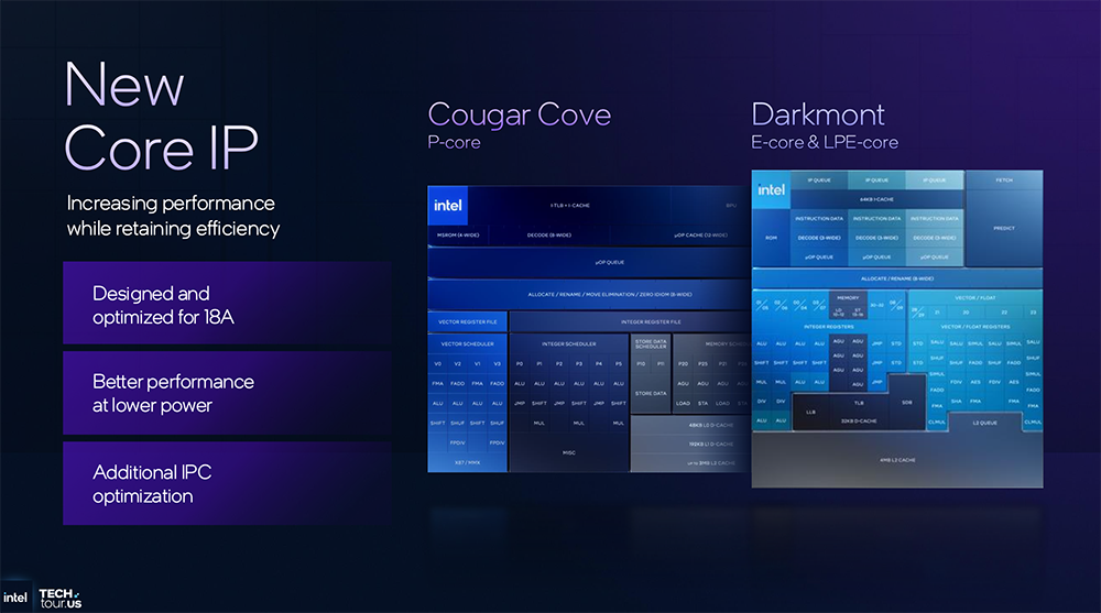 Panther Lake CPU包含Cougar Cove P核、Darkmont E核和 Darkmont LP-E核。
