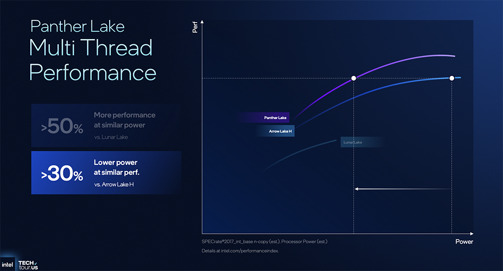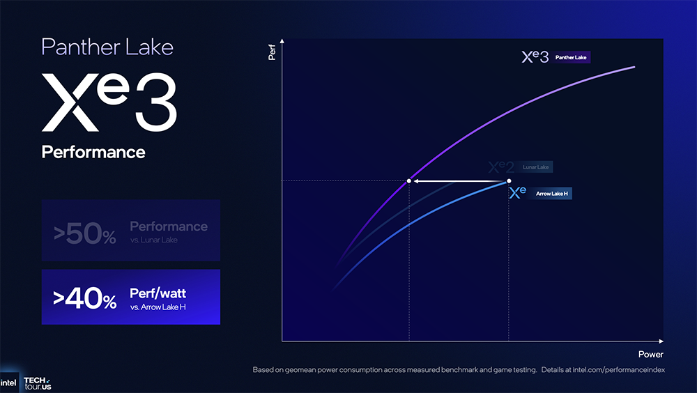 相比上一代,Panther Lake实现图形性能提升50%,每瓦性能提升40%。