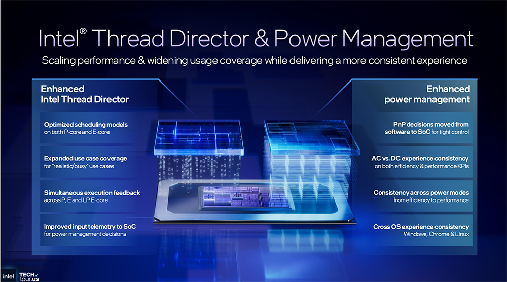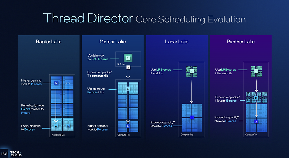 Panther Lake利用线程控制器(Thread Director)来调度混合核心,在执行多线程操作时实现资源高效利用。