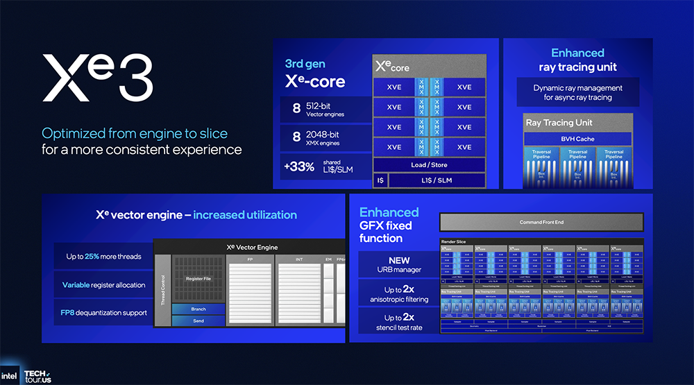 Xe3架构里升级了向量引擎、后端处理功能和光线追踪单元,有8个512-bit向量引擎、8个2048-bit XMX引擎,L1缓存容量提高33%。