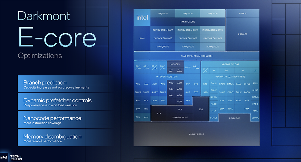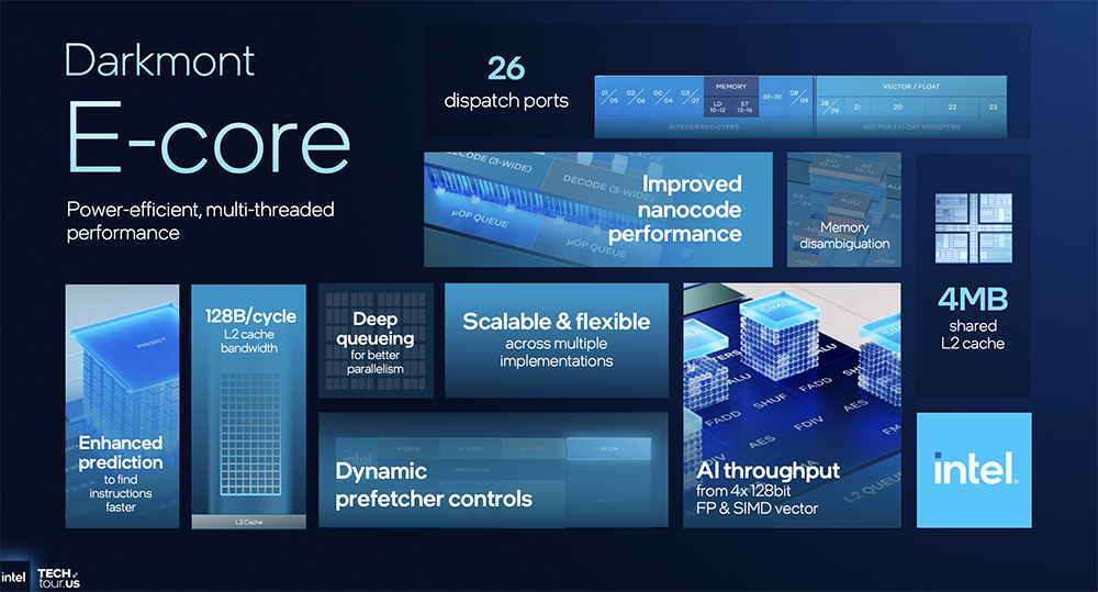 Darkmont E核基于上一代Skymont E核构建,拥有26个调度端口,向量吞吐量、L2带宽更高,并且纳码性能有所提升(该性能最初在 Crestmont 架构中引入)。