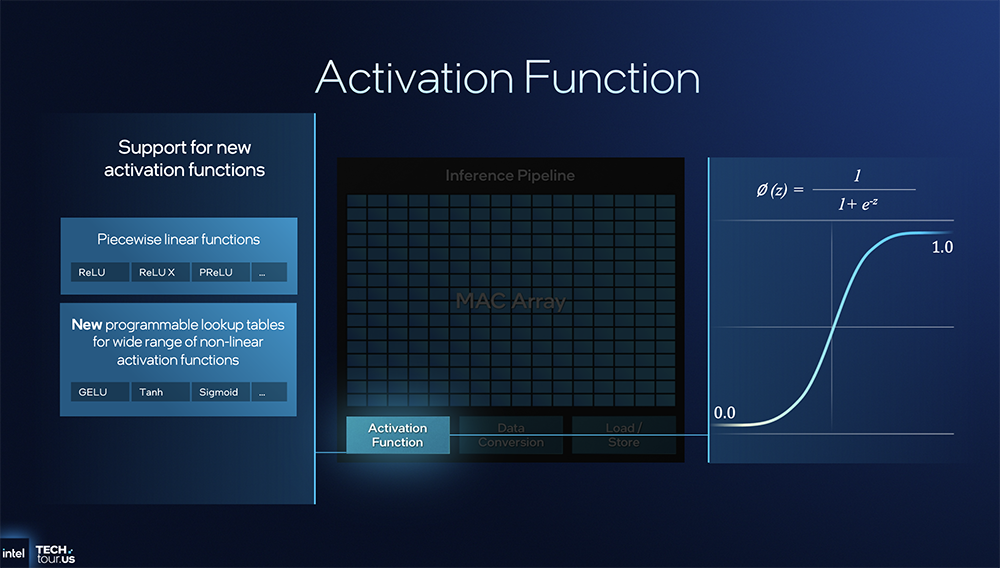 另一项创新是可编程激活函数。英特尔NPU过去只支持一种较为线性的激活函数,现在可全面兼容多种可编程激活方式,轻松实现Sigmoid、Tanh等常见激活函数。