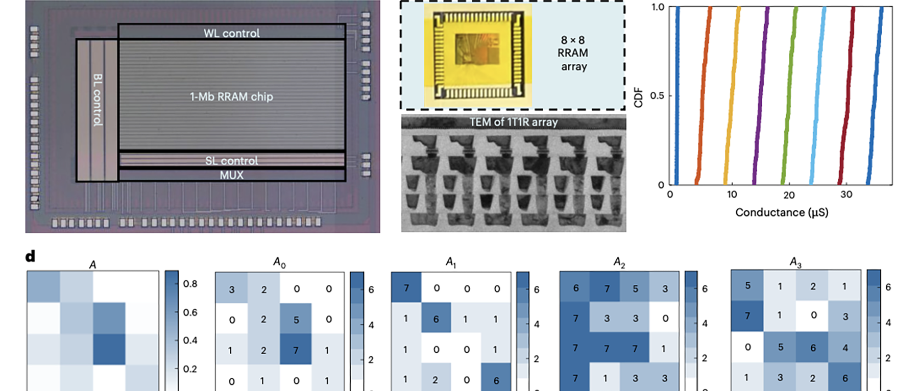 此外,模拟低精度矩阵求逆和模拟高精度矩阵-向量乘法运算两个电路的阻变存储器阵列在40nm CMOS工艺平台制造,可实现3比特电导态编程。