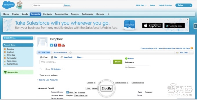 使用起来也很简单,在Salesforce网站,点击Elucify按钮,就可以及时更新原有信息并增加最新的潜在目标联系方式。基本上,销售需要的信息都有,比如:手机,邮箱,公司信息,决策者等等。
