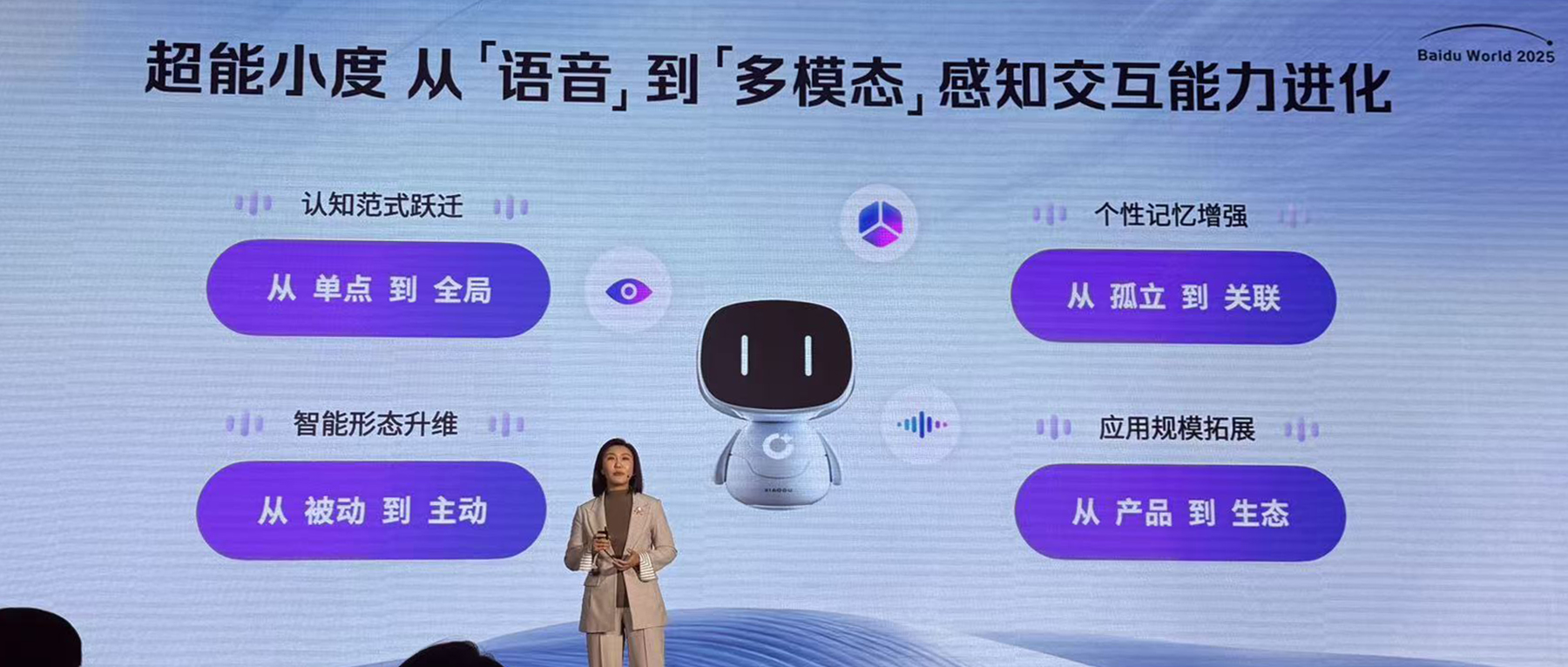 李莹谈道,超能小度通过文字、声音、图片、视觉、手势等多模态的感知交互,可以实现从单一到全局、从被动到主动的理解以及个性化记忆。她认为这是人机交互的一次重要变革,可以让设备从被动执行命令的工具变为主动思考的伙伴。
