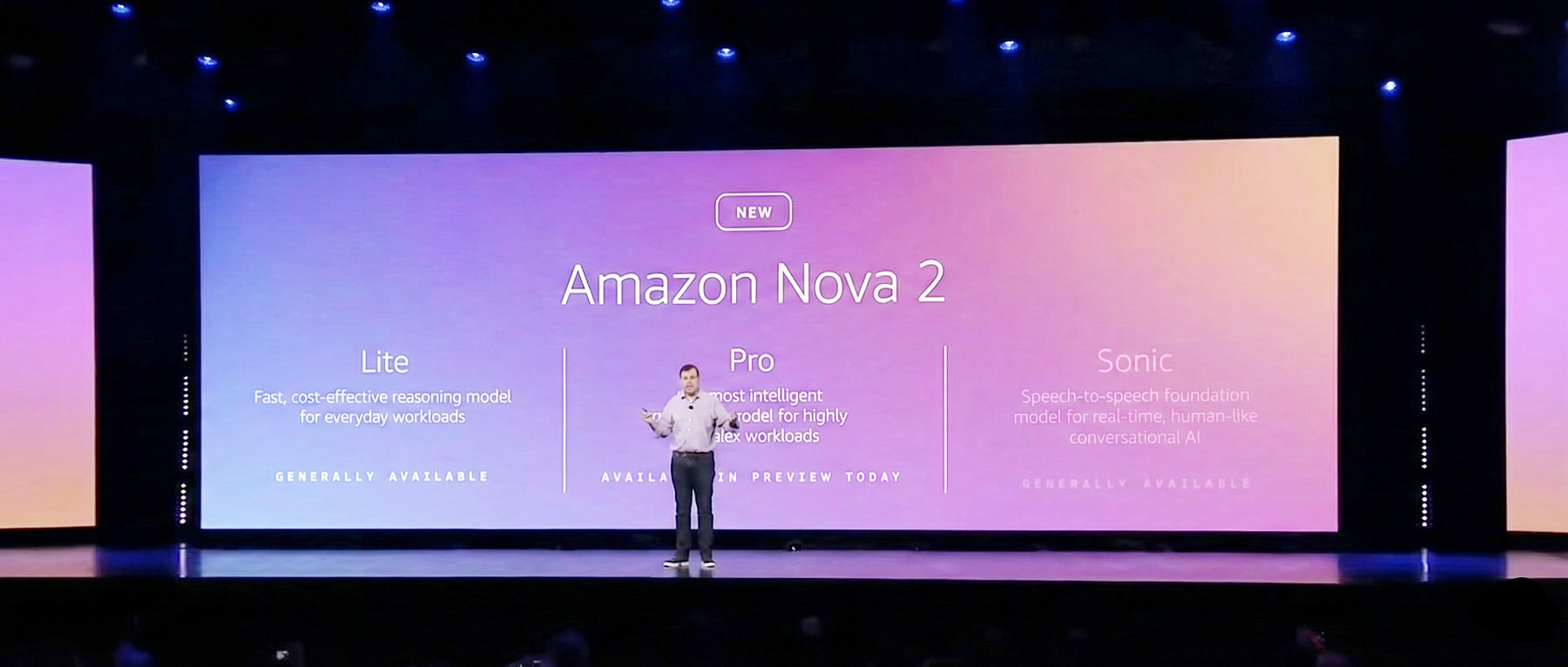 Amazon Nova 2系列首发4款模型:经济高效推理模型Lite,高智能推理模型Pro,语音转语音的实时拟人对话式AI模型Sonic,以及面向多模态推理和图像生成的统一模型Omni。