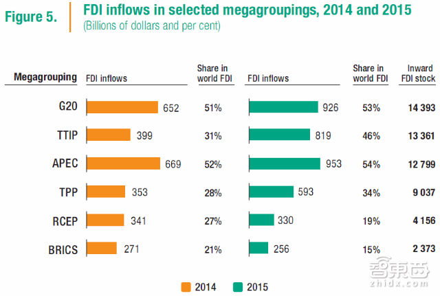 G20(20国集团)、TTIP(跨大西洋贸易与投资伙伴)、APEC(亚洲太平洋经济合作组织)、TPP(跨太平洋伙伴关系)、RCEP(区域全面经济伙伴)以及BRICS(金砖五国)占全球FDI流入的比例如图5所示。
