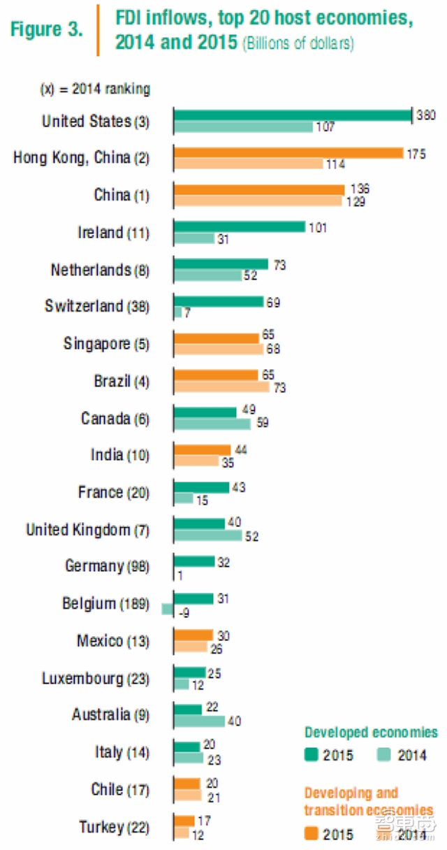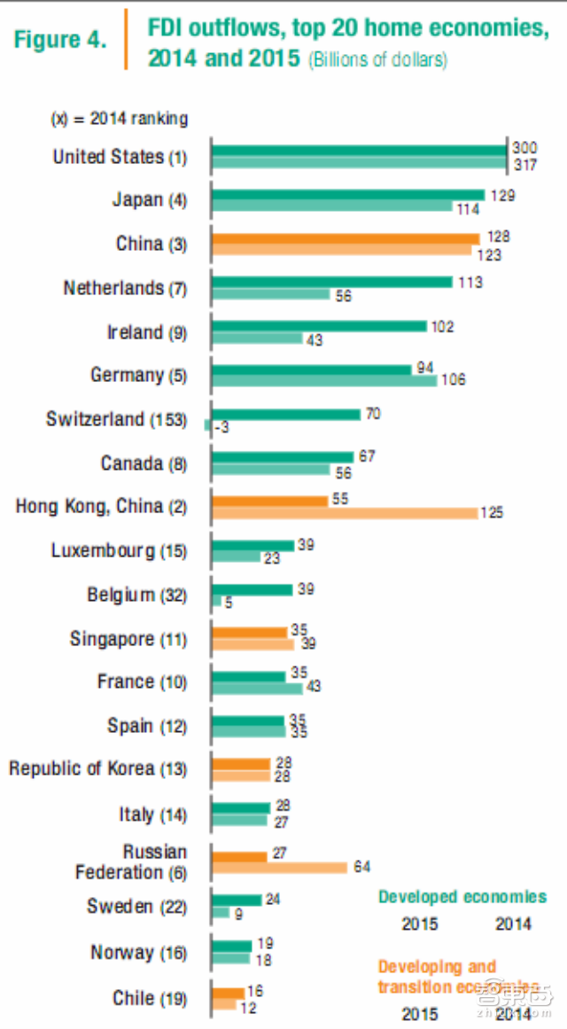 在连续三年的下降之后,2015年发达经济体流出的FDI增长了33%,达到了1.1万亿美元,占比也达到了全球的72%,高于2014年的61%。这也是从2007年开始连续下滑至今首次实现的增长。不过尽管终于呈现了增长态势,但发达经济体流出的FDI距2007年巅峰时期的水平还是有40%的差距。其中,欧洲成为了2015年世界最大投资区域,FDI流出达到5760亿美元。相比之下,北美跨国公司外商投资则表现出持平态势,加拿大的显著增长被美国的缓步下降所抵消。然而,美国仍然是世界上最大的投资者,紧随其后的是日本。