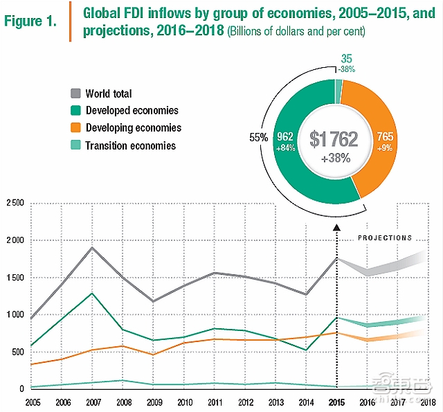 2015年的FDI表现出强烈的复苏态势,总体上涨了38%,达到1.762万亿美元,是2008年全球金融危机爆发以来的最高水平。这份由联合国贸易发展组织编撰的报告对发达经济体和发展中经济体数据进行了对比,绿色代表发达经济体,橘色代表发展中经济体。(在图1中,灰色代表了世界总量,浅绿色代表过渡经济体。)