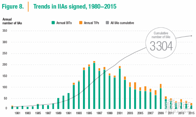 在新增的31项国际投资协议(international investment agreements,IIAs)中,有20项是双边投资协定(bilateral investment treaties,BITs)以及11项投资条约规定(treaties with investment provisions,TIPs)。截止到2015年年底,全球累计的IIA达到了3304项(2946项BITs以及358项TIPs)。